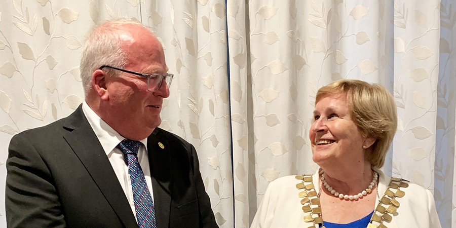 Distriktsguvernør 2021-22, Hans Olav Osbak, overlater roret - og guvernørkjedet - til Gunhild Aalstad, som blir vår distriktsguvernør i 2022-23. Foto: Tor Odd Silseth.