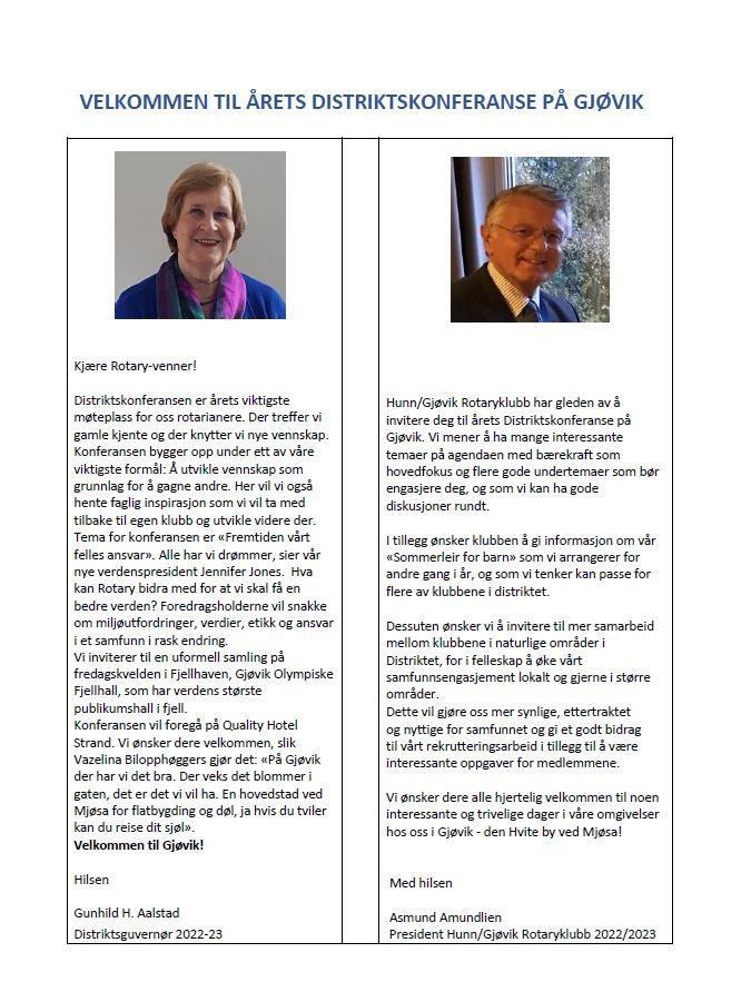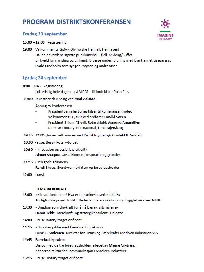 Velkommen til distriktskonferansen på Gjøvik 23. -25. september. Her finner du oppdatert program for konferansen. OBS! Om registrering fredag: De som skal delta på fredag med overnatting, kan registrere seg på hotellet før programstart i Fjellhallen.Her følger oppdatert program: