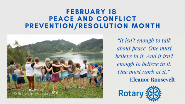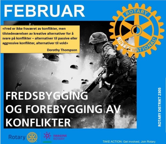 Fredsarbeid og konfliktforebygging er Rotarys tema for februar måned. Mer enn 100 millioner mennesker er på flukt som følge av konflikt, krigshandlinger, vold, forfølgelse og brudd på menneskerettighetene. Behovet for konfliktforebygging er kjempestort!Oppfordring til klubbene i d-2305: